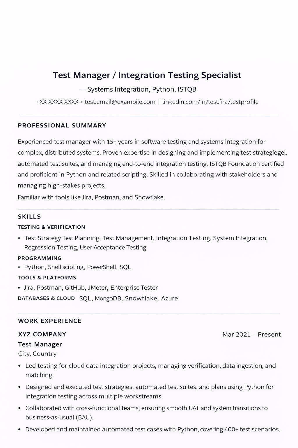 | Plain Test Manager / Integration Testing Specialist | High | Single column, clean hierarchy, readable bullets, no graphics | Very little formatting risk |
