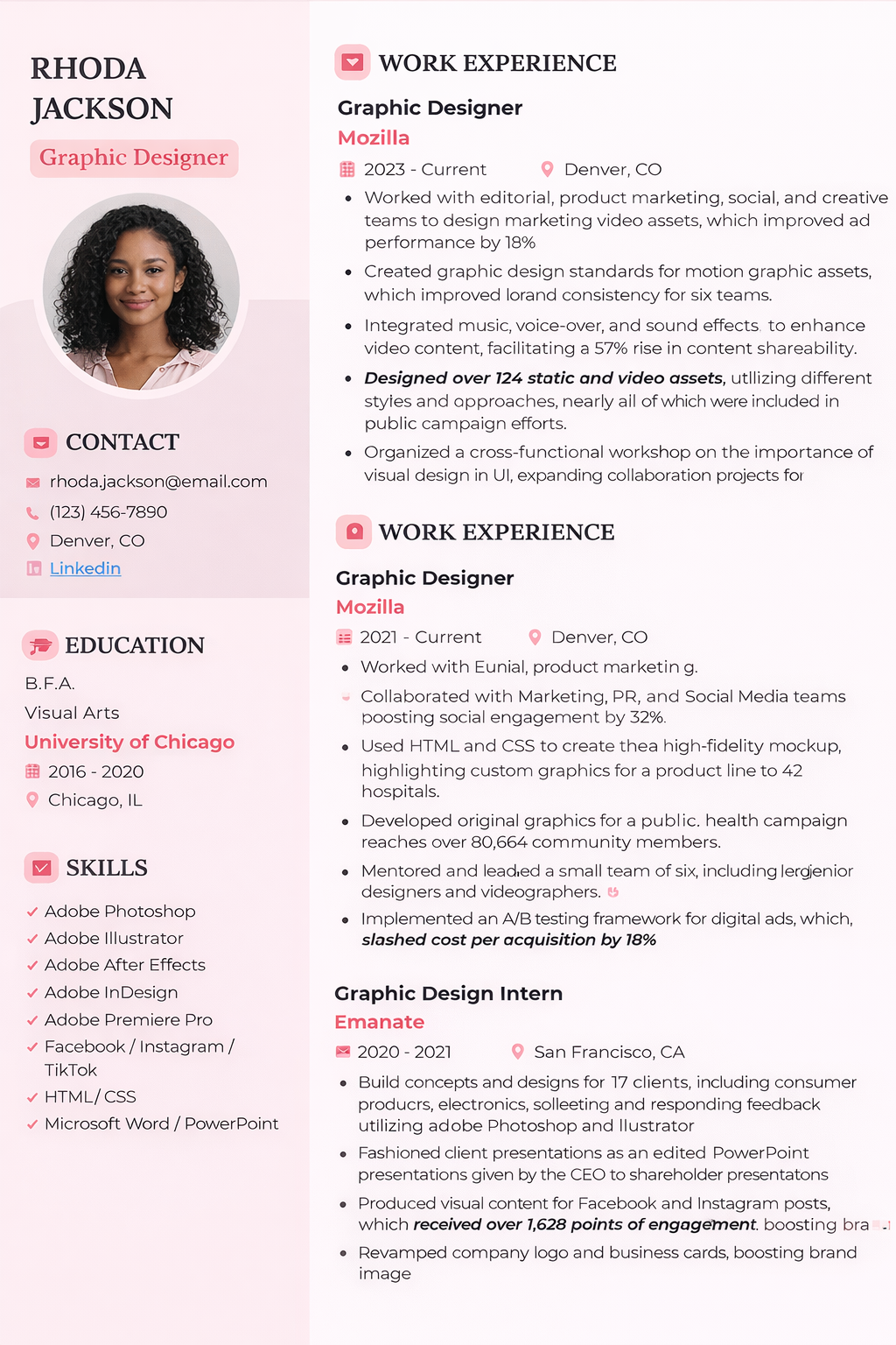 | Rhoda Jackson pink resume | Medium | Still text-based with recognizable sections | Two-column parsing can mix content |